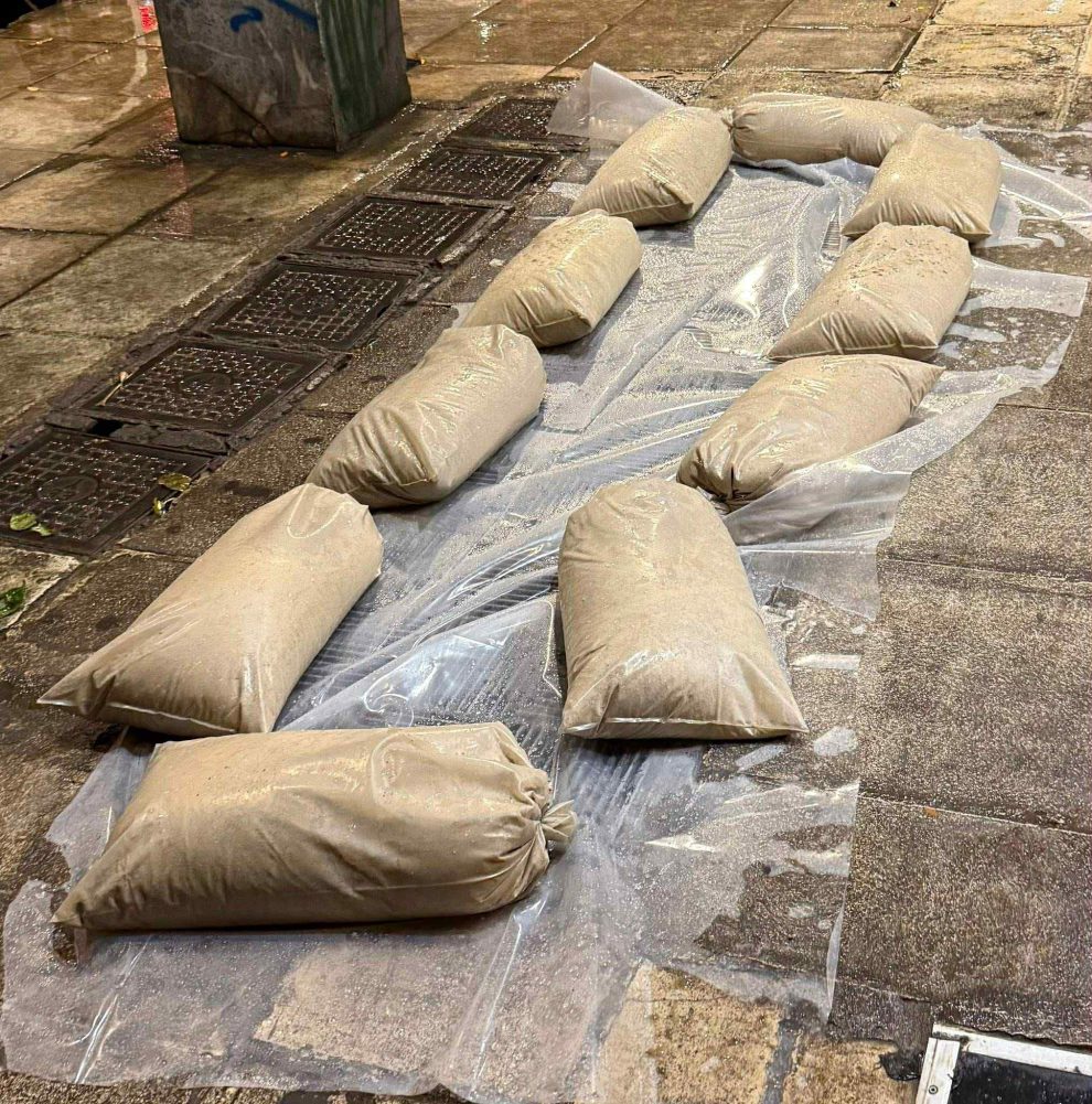 Σε αυτό το υπόγειο είναι ο υποσταθμός ενέργειας που να βρέξει καταρρακτωδώς μπαίνουν νερά και οι περιοχή μένει χωρίς ρεύμα για πολλές ώρες , και ασφαλώς δεν κάνουν ένα τσιμεντένιο προστατευτικό να μην μπαίνουν νερά μέσα….. κάποιος κάτοικος και μπράβο του έστησε μια κατασκευή με νάϋλον και σακιά πρόχειρα για προστασία.