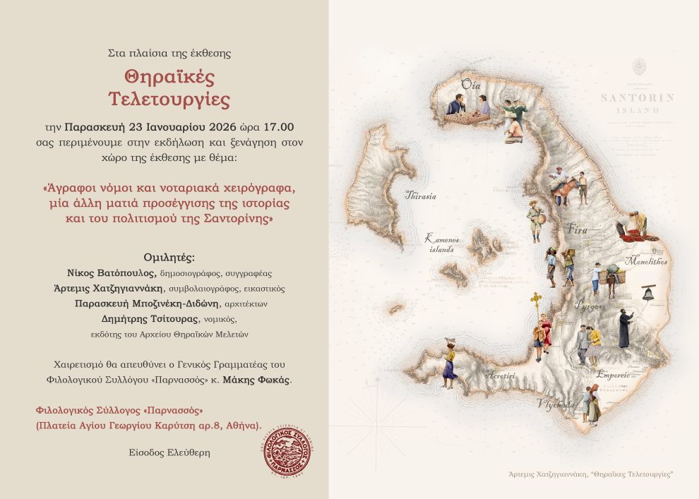 Θα μιλήσουν οι: Νίκος Βατόπουλος, δημοσιογράφος – συγγραφέας, Άρτεμις Χατζηγιαννάκη, συμβολαιογράφος – εικαστικός, Παρασκευή Μποζινέκη-Διδώνη, αρχιτέκτων, Δημήτρης Τσίτουρας, νομικός – εκδότης του Αρχείου Θηραϊκών Μελετών.