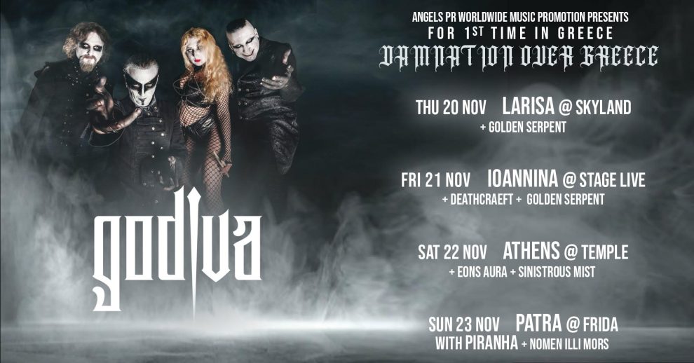 Το μεγαθήριο του συμφωνικού death metal GODIVA από την Πορτογαλία, εξαπολύει απόλυτη καταστροφή σε όλη την Ελλάδα με τη νέα του βάναυση περιοδεία: “DAMNATION OVER GREECE”.