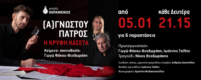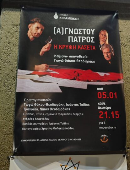Μια παράσταση–εξομολόγηση, που δεν ζητά οίκτο· ζητά να ακουστεί. Το «(Α)ΓΝΩΣΤΟΥ ΠΑΤΡΟΣ» φέρνει στη σκηνή μια αλήθεια που για χρόνια έμεινε παγιδευμένη σε μια κασέτα — κι όταν τελικά πατά το “play”, δεν υπάρχει επιστροφή. Η σκηνοθεσία της Γωγώς Φάκου-Θεοδωράκη επιλέγει τη λιτότητα, αφήνοντας τον λόγο να γίνει μαχαίρι και χάδι μαζί. Χωρίς περιττά στολίδια, με επίκεντρο την ανθρώπινη ρωγμή.