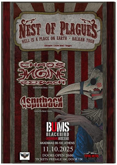 Οι Total Metal & Angels PR παρουσιάζουν τους NEST OF PLAGUES από την Ουγγαρία που έρχονται στην Αθήνα στο πλαίσιο της περιοδείας τους “Hell is the place on Earth – Balkan tour” το Σάββατο 11 Οκτωβρίου στο BUMS BLACKBIRD. Μαζί τους στη σκηνή οι Groove Metalers SPITBACK από την Ελλάδα και οι Groove/Death Metalers CHAOS ENGINE RESEARCH από την Πολωνία.